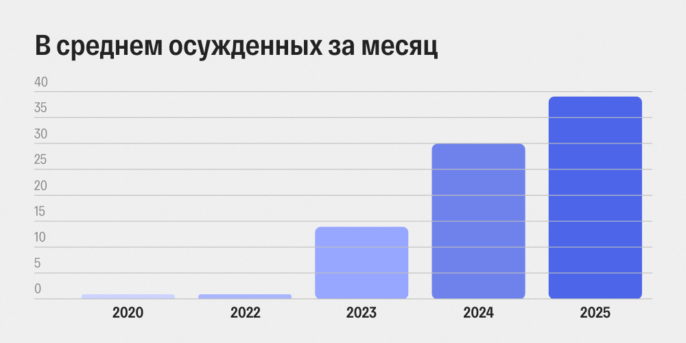 До 2022 года суды в России выносили в среднем один приговор о госизмене и шпионаже в месяц. В 2023 году в месяц выносили уже 14 приговоров, в 2024 году — 30. В первой половине 2025-го — 39.