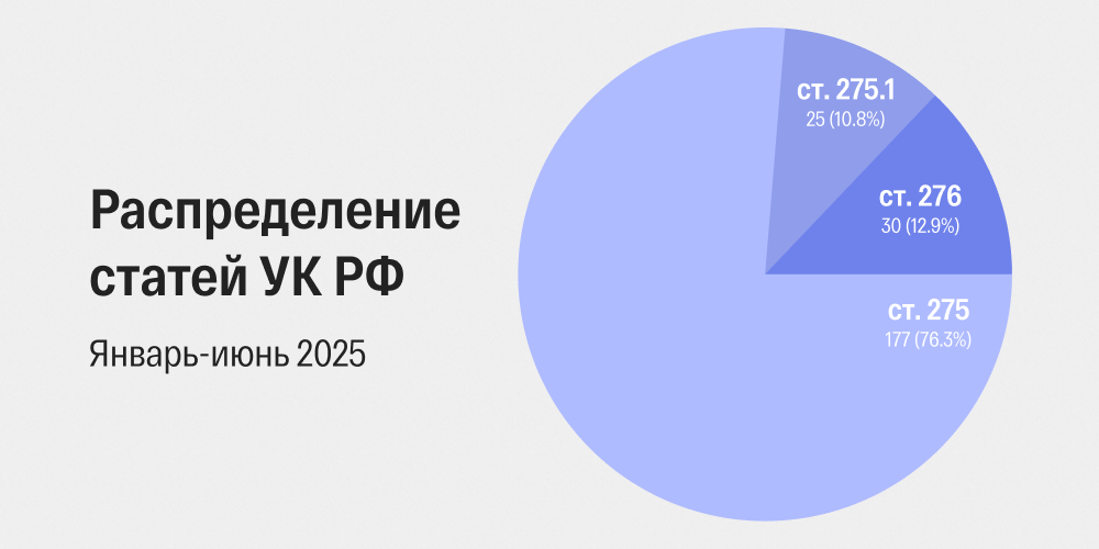 177 человек из 232 были осуждены за госизмену. Доля этой статьи в так называемых «делах о госбезопасности» составляет 76%. В 2024 году она составляла 68%.
