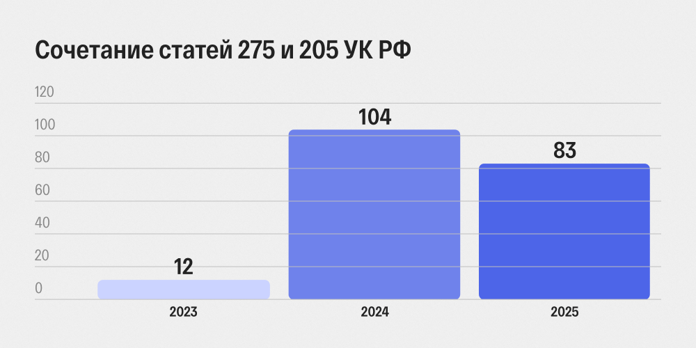 Тренд военного времени — сочетание статей 275 (госизмена) и 205 УК РФ (теракт) в одном деле. До 2023 года не было ни одного случая, когда фигуранту инкриминировали одновременно и террористическую статью, и статью о государственной измене или о шпионаже.