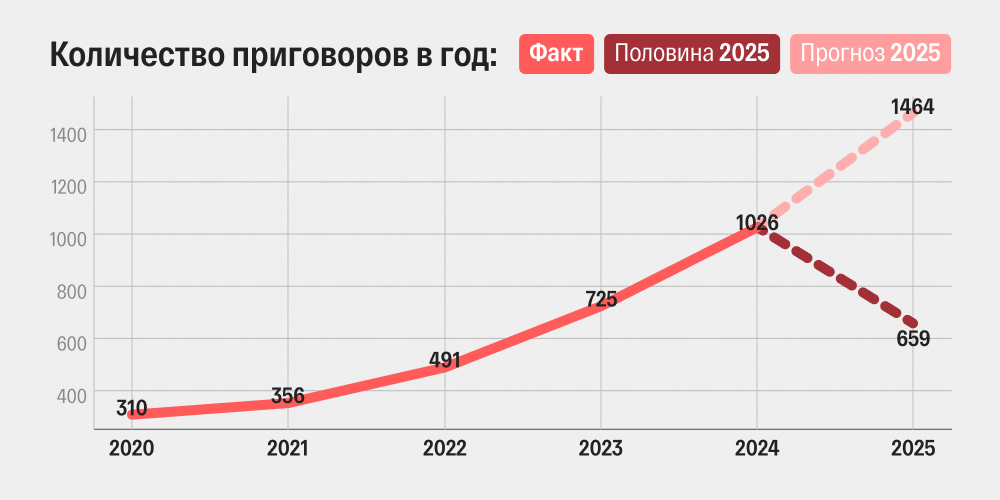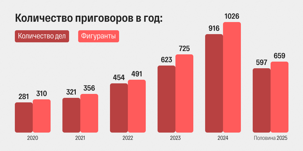 В 2025 году зафиксирован исторический максимум приговоров по террористическим статьям: (Ст. 205, 205.1, 205.2, 205.3, 205.4, 205.5, 205 УК РФ). Согласно исследованию Кирилла Парубца, сделанного специально для «Первого отдела», за первые шесть месяцев 2025 года военные суды вынесли по ним как минимум 597 приговоров. Фигурантами дел стали 659 человек.