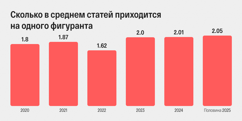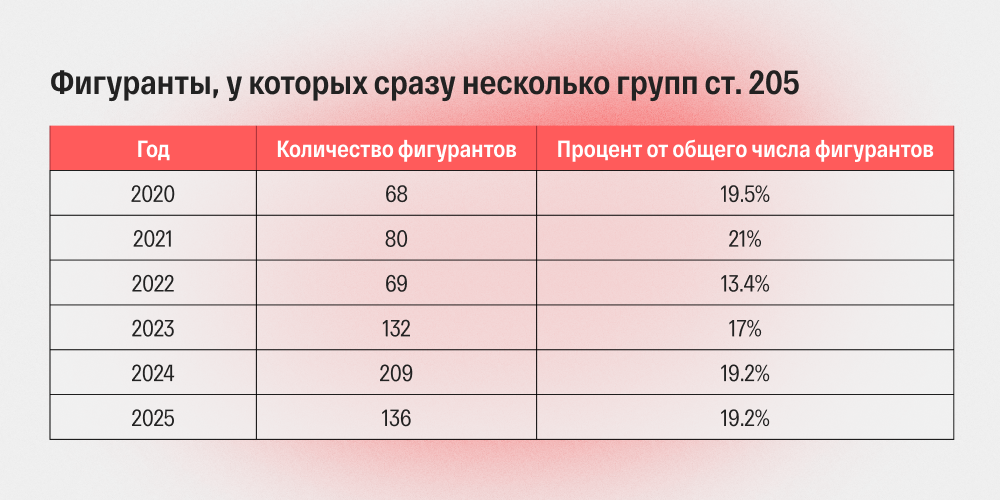 Также растет практика сочетания нескольких террористических статей в отношении одного фигуранта. Речь о 205.1 УК РФ — Содействие террористической деятельности; 205.2 УК РФ — Публичные призывы к осуществлению террористической деятельности, публичное оправдание терроризма или пропаганда терроризма; 205.3 УК РФ — Прохождение обучения в целях осуществления террористической деятельности; 205.4 УК РФ — Организация террористического сообщества и участие в нем; 205.5 УК РФ — Организация деятельности террористической организации и участие в ней).