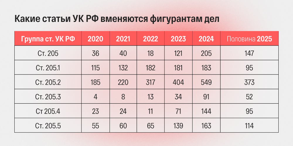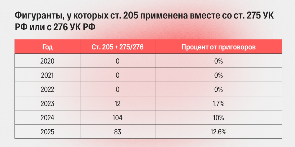 Начиная со второго года полномасштабного вторжения российские силовики применяют сочетание статей 205 УК РФ (теракт) и 275 (госизмена). В 2023 появилось 12 таких фигурантов, в 2024 году — уже 104, в первой половине 2025 года — 83.