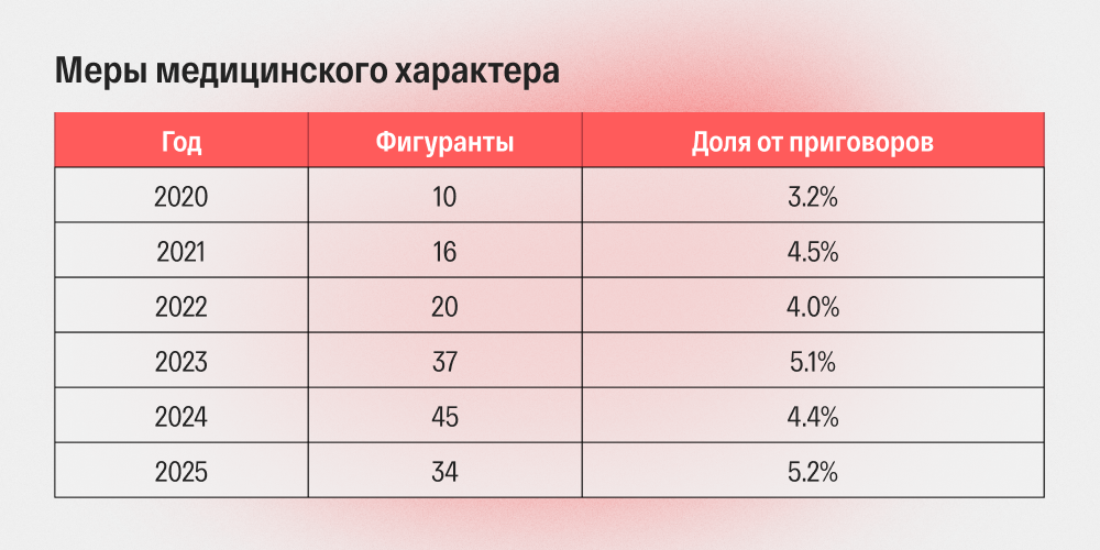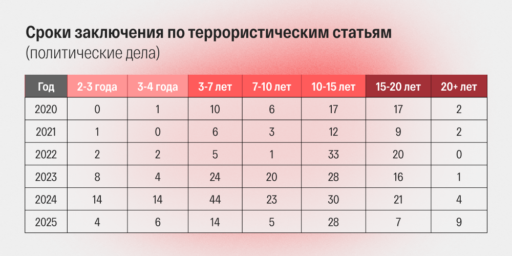Наказания по террористическим статьям ужесточаются. Так, в первой половине 2025 года суды вынесли столько же приговоров на сроки более 20 лет, сколько за пять предыдущих лет. При этом количество «мягких» приговоров снижается несмотря на общее увеличение количества дел.