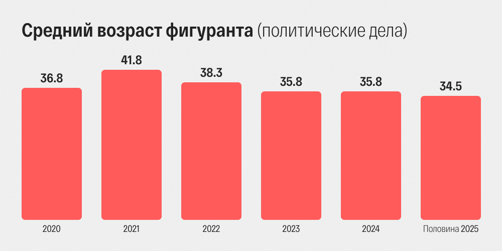 Средний возраст осужденных по террористическим статьям снижается. После резкого роста в 2021 году (с 36,8 до 41,8 лет), к 2025 году он достиг 34,5 лет.